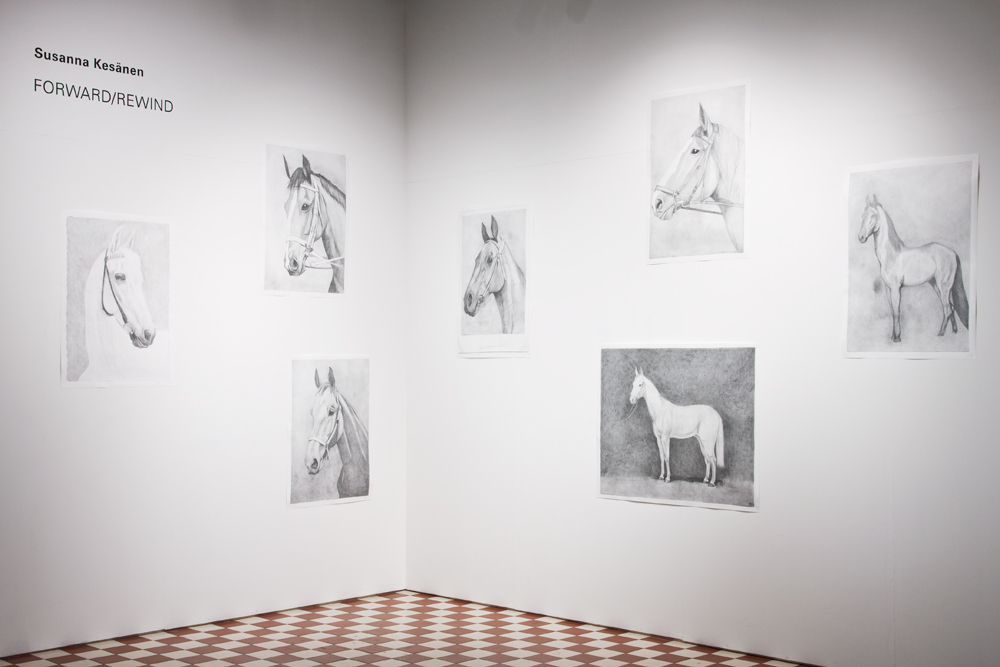 Mietin ajan ja paikan välisiä suhteita, sekä niiden mukaan muuttuvaa identiteettiäni, jota lapsuuden paikat, maaseutu ja kaupunkiin muutto ovat muokanneet. Löydän hevospostikortit siististi kansioituna vanhan koulupöydän laatikosta. Piirrän niitä paperille lyijykynällä. Haluaisin viipyä kuvissa pitkään.