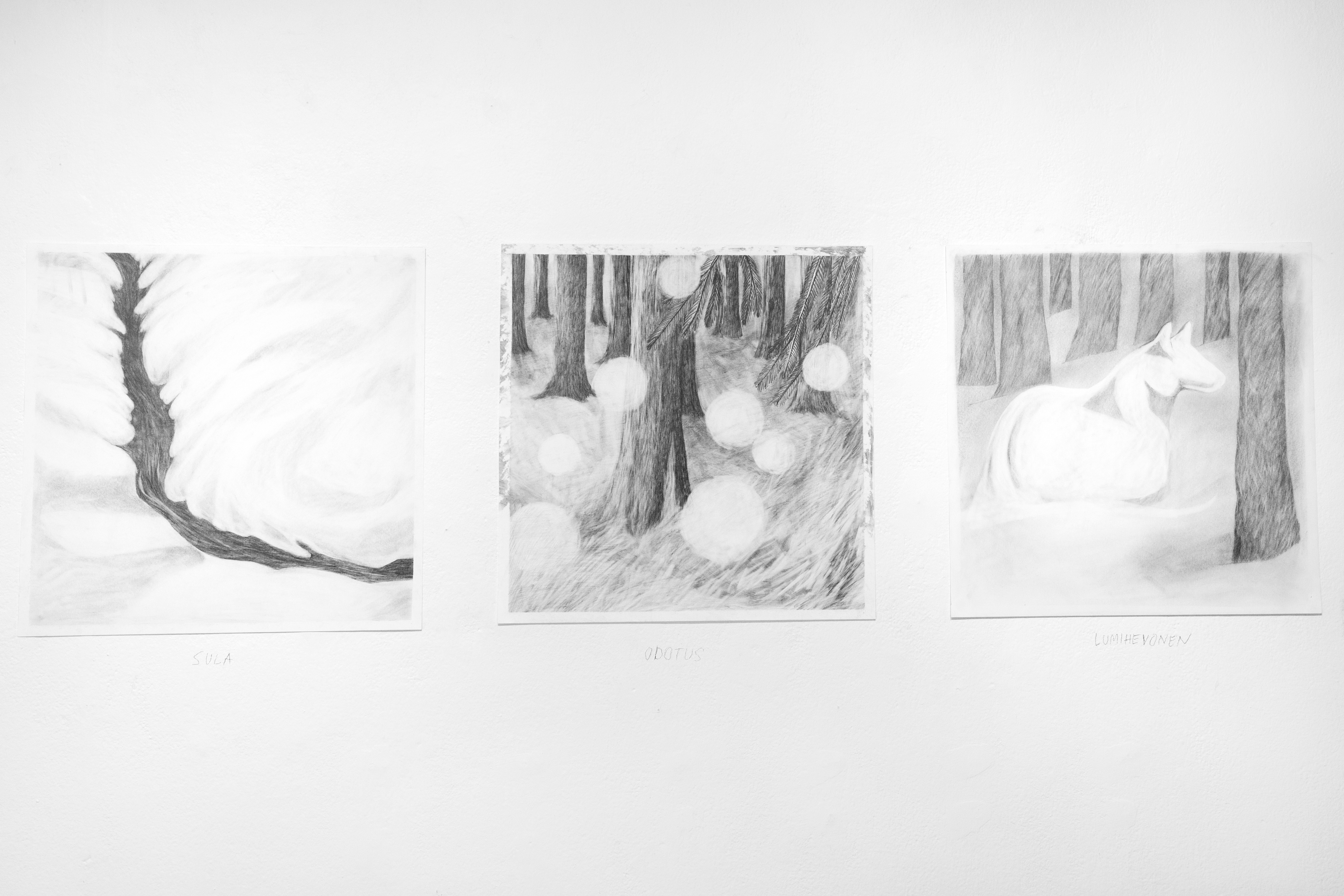 Lumisade kesäyössä -näyttely heijastelee tunteita elämän ennalta-arvaamattomuuden ja ristiriitaisuuden äärellä. Piirtämisen ele kääntää valokuvan todellisuuden toiselle kielelle, ja avaa reitin unenomaiseen maailmaan, jossa vallitsee oma aika.